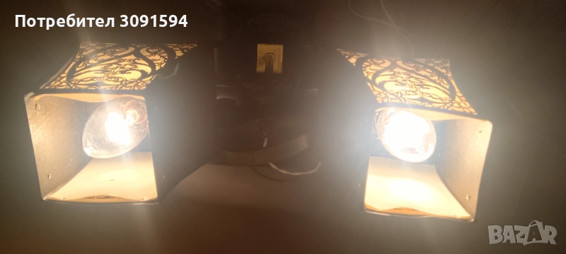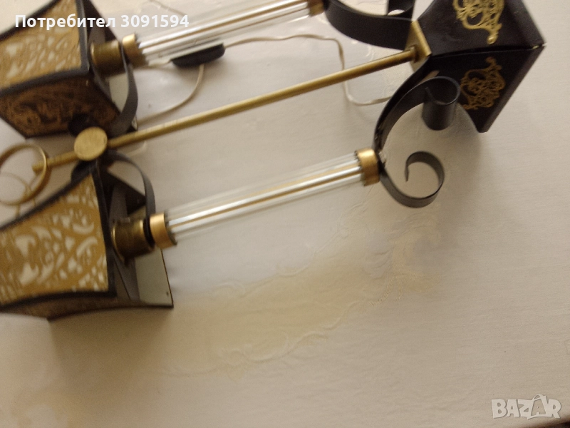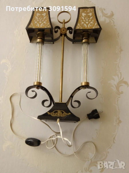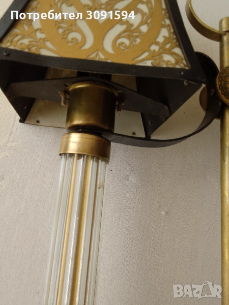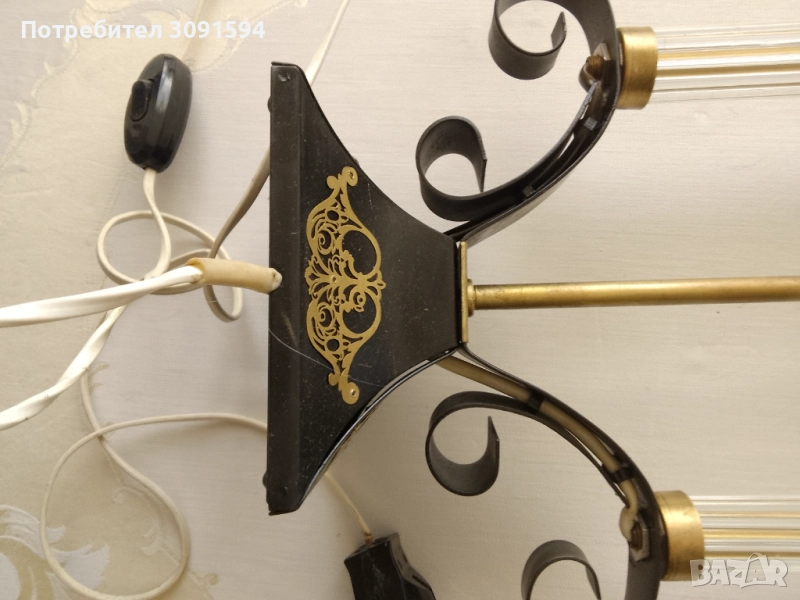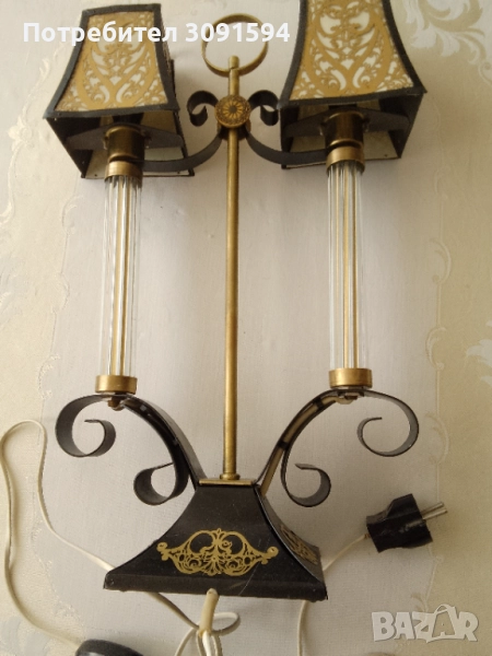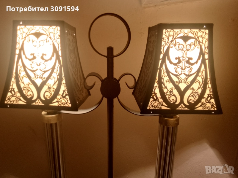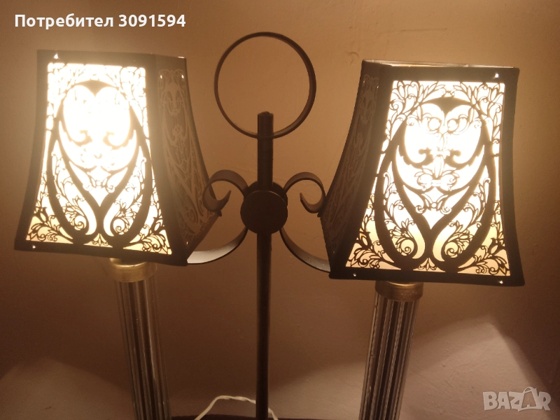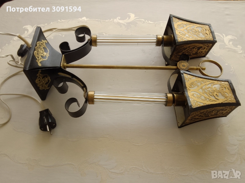 лампа в стил Арт Деко, около 50-те години на миналия век, Русия Тази уникална декоративна винтидж настолна лампа се състои от, преливащ се метал, върху абажурите и основата. Всеки абажур има бял целулоиден фон от другите две страни, пропускайки светлина, създавайки атрактивен силует. Рамката е съставена от две стъклени колони Стъклените колони са изработени от няколко тънки стъклени пръчки, всички в отлично състояние, групирани заедно от кръгъл месингов диск. Тази лампа е с две малки стандартни крушки на винт с мощност до 40 вата всяка и в момента е оборудвана с прозрачни крушки тип „, но би могла да се побере и в друга форма. Лампата е наскоро преинсталирана и е в напълно работеща изправност и готова за употреба, с ключ на кабела. Лампата е в много добро винтидж състояние
