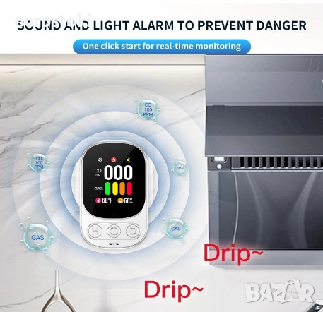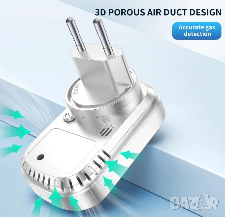 Комбиниран детектор за газ и въглероден оксид за домашна употреба. Включете това устройство в домашен електрически контакт, то може непрекъснато да следи нивото на въглероден оксид (CO) и горивни газове, като природен газ, втечнен природен газ (LNG), пропан-бутан (LPG), метан (CH4), етан (C2H6), пропан (C3H8), бутан (C4H10) и др.