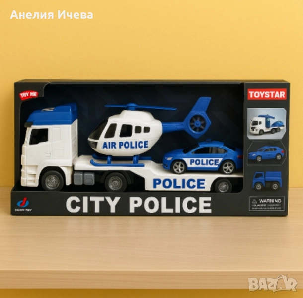 Тип продукт: Коли и писти за колички; 3 в 1 играчка: включва автовоз, полицейска кола и хеликоптер; Интерактивни функции: бутони със звукови ефекти и светлини (Try Me); Реалистичен дизайн: вдъхновен от истинска градска полицейска техника; Образователна стойност: насърчава ролевата игра, координацията и въображението; Безопасна за деца: изработена от висококачествени и нетоксични материали; Ефекти: светлини и звуци при натискане на бутон (на кабината на камиона) 1 бр. голям полицейски автовоз; 1 бр. спортна полицейска кола; 1 бр. хеликоптер с въртящи се перки.