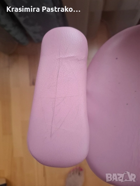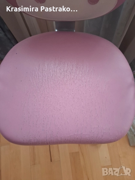 Розов детски стол за бюро-коте. Кожата е нацепена, но затова и цената е ниска и би могла да се коментира.
