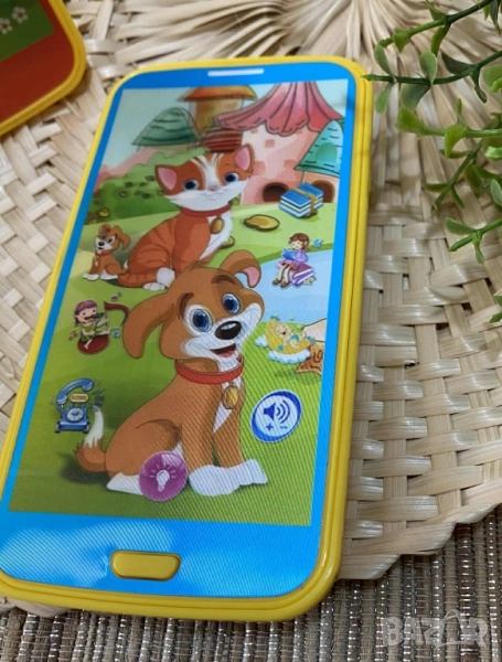 Тип продукт: Детски играчки; Този смартфон е шарен, атрактивен и НЕ ОБЛЪЧВА ДЕЦАТА Има множество функции които се ползват с докосване по екрана: 10 различни песни на български език; 4 различни приказки на български език; Различни рингтонове на мобилни телефони; Животинката на екрана реагира при докосване на различните части на тялото: главичка, коремче, крачета, опашка; Функция за запис и възпроизвеждане; -Гатанки; -Фенерче; -Бутон за включване / изключване; -Размери:12.00cm x 2.00cm x 17.00cm; Захранване: 3 батерии AAA зад капачето , винт ( не са вкл. в комплекта).
