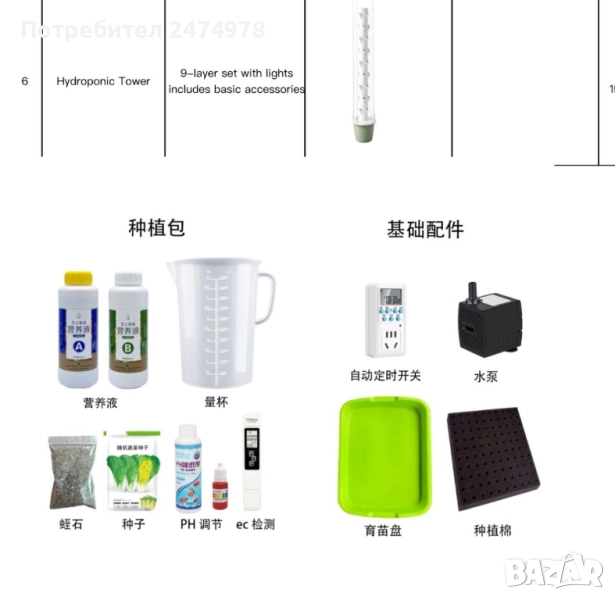 Хидропонична кула с LED осветление. Комплектът включва всички необходими аксесоари за отглеждане на растения по хидропонен метод. Светлините могат да бъдат настроени да светят в 3 режима на продължителност. Моторчето за движение на водата, може да се пуска в различни режими на продължителност и сила на струята. Допълнителни аксесоари в комплекта: листчета за проверка на PH нивото на водата и уред за TDS метър за измерване на чистота и температура на водата.