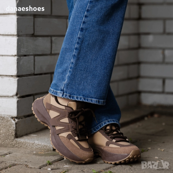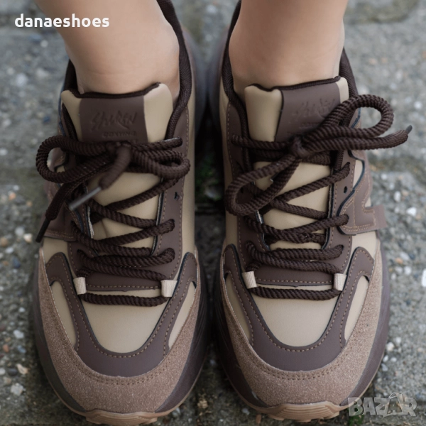 Ефектни дамски сникърси в кафяво и бежово. Груба подметка с грайфер, анатомична извивка на ходилото. Номерация 36-41. Модела е умален с един номер!