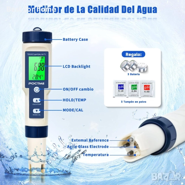 Poctme pH метър 5 в 1, pH/TDS/EC/Соленост/Температура, измервател на питейна вода, басейни, хидропоника, растения, аквариуми, спа центрове, морска вода, обратна осмоза LCD екран