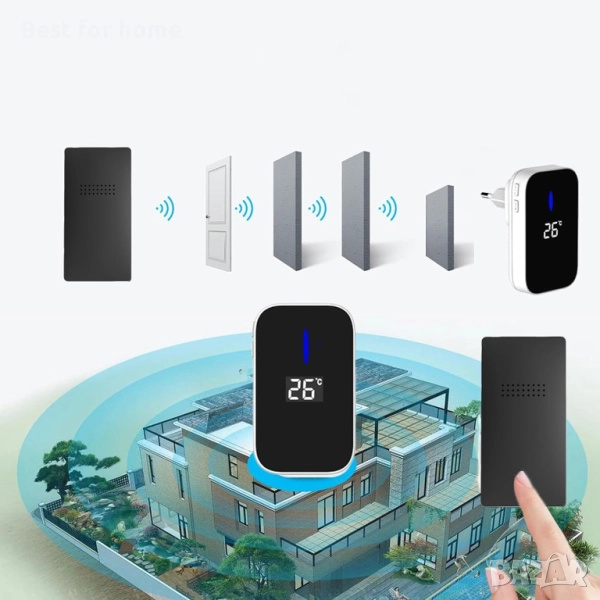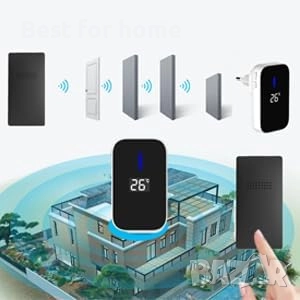 Комплект безжичен звънец с вграден термометър: Изпитайте удобството на нашия безжичен звънец с вграден термометър. Следете вътрешната температура чрез цифровия екран на приемника. Идеален за домове, апартаменти, училища, селски къщи, офиси и други, нашият безжичен звънец с термометър внася интелигентна функционалност във вашето пространство.
