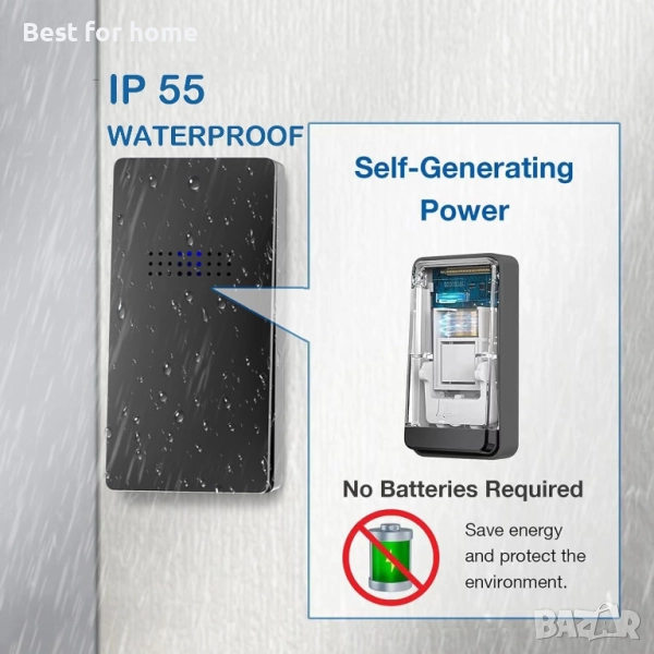 Интелигентно и устойчиво решение за звънец: Надстройте се към бъдещето с нашия самозахранващ се безжичен звънец – Край на затрудненията с купуването на батерии! Иновативният дизайн осигурява нисковъглеродно и екологично решение. Както предавателят (бутонът), така и приемникът работят без батерии, генерирайки енергия, когато бутонът е натиснат. Кажете сбогом на смяната на батериите и се насладете на непрекъсната функционалност на звънеца.