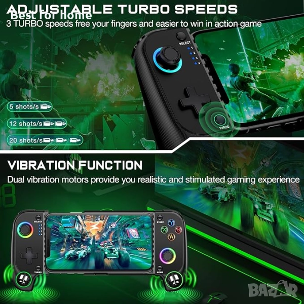 【3-степенна турбо функция и двойна вибрация】 Мобилният гейм контролер има 3 регулируеми скорости на турбо функцията: 5 изстрела/сек, 12 изстрела/сек и 20 изстрела/сек. Можете да настроите бутоните Turbo + A/B/X/Y/L/ZL/R/ZR за лесна победа в игри със стрелба и бойни игри. Продължителното натискане на бутона TURBO за 5 секунди може да изчисти всички бутони на TURBO функцията. Двойна вибрация на двигателя за по-добро потапяне в играта за върховно мобилно гейминг изживяване с нашия мобилен контролер.