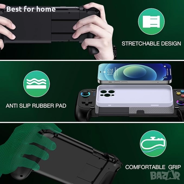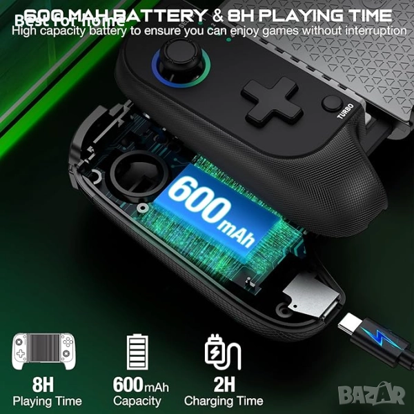 【Дълготрайна игра и перфектен размер】Контролерът за телефон за Android се захранва от акумулаторна батерия с капацитет 600mAh, която може да се използва около 6 часа при напълно заредени светлинни ефекти, отговаряйки на нуждите на ежедневната употреба. Контролерът за iPhone е с компактни размери, лек и лесен за носене, което го прави идеален за игри в движение.