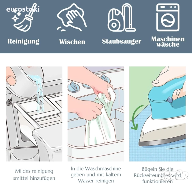 Редовно почиствайте с прахосмукачка или метете, за да отстраните замърсяванията. Попивайте разлятата течност веднага с кърпа. За цялостно почистване килимът може да се пере на студена, деликатна програма. Избягвайте топлина или белина, за да запазите качеството.