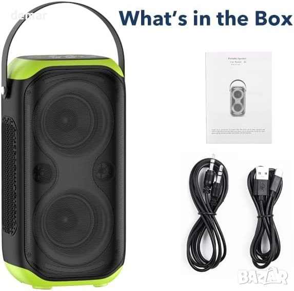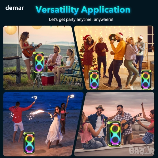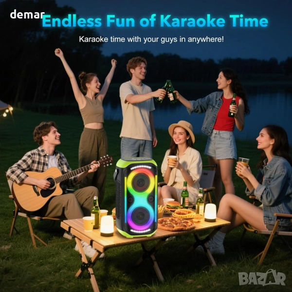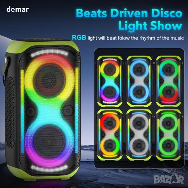 Преносимият Bluetooth високоговорител A98 осигурява мощен звук от 160 W с дълбок бас и стерео яснота, разполагайки с двойни нискочестотни високоговорители, високочестотен високоговорител и цветни LED парти светлини, които се синхронизират с музиката. Той поддържа Bluetooth 5.0 с обхват до 30 метра, плюс кабелни връзки чрез AUX, възпроизвеждане на U-disk и 6,35 мм вход за микрофон, което го прави универсален за партита, караоке, къмпинг и събития. С акумулаторна батерия от 12000 mAh, предлагаща 4–20 часа време за възпроизвеждане, той е идеален както за закрито, така и за открито. True Wireless Stereo ви позволява да сдвоите два високоговорителя за 320 W съраунд звук, а управлението на осветлението с едно докосване добавя удобство. В комплект с USB кабел за зареждане, AUX кабел и ръководство за потребителя, той е и практичен и забавен подарък за любителите на музиката.