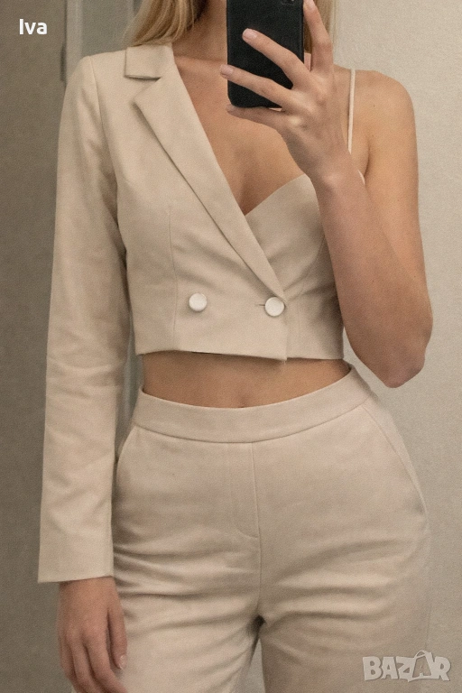 Продава се модерен дамски комплект в бежово, състоящ се от елегантен топ с асиметричен дизайн и дълъг ръкав, съчетан с прав панталон с висока талия. Подходящ както за специални поводи, така и за ежедневието – когато искате да изглеждате различно и впечатляващо.