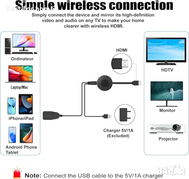 【Лесна работа, малък размер】Miracast адаптерът е добър за скриване, малък размер, не изисква място, лесно се скрива зад телевизора. Този Miracast HDMI адаптер е лесен за работа, не изисква драйвери или приложения, без повече цапащи кабели, само външна WLAN антена за свободно приемане на безжични сигнали. Настройките за работа могат да бъдат намерени в ръководството за продукта (методът на свързване варира в зависимост от устройството). Забележка: адаптерът трябва да се захранва от външен източник на захранване (поне 5V/1A).