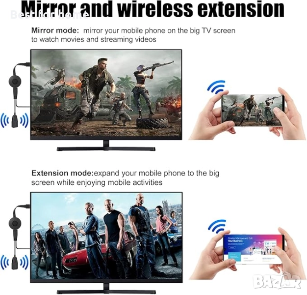 [Прожекция на голям екран/двоен режим на същия екран] режим на прожекция на екран - Докато гледате филми и чатите, този безжичен HDMI адаптер за прожекция може да възпроизвежда прекрасни видеоклипове на големия екран и да извършва други операции на мобилния телефон. Режим на същия екран - този безжичен дисплей донгъл проектира мобилни игри, филми, видеоклипове от конференции и др. на големия екран, отвъд ограниченията на малкия екран, пренасяйки работата и забавлението на големия екран!