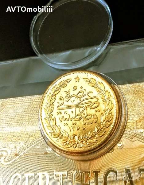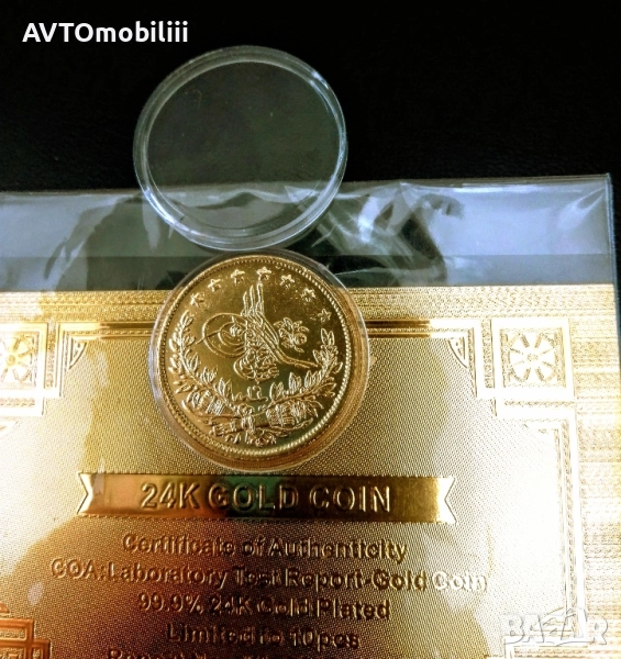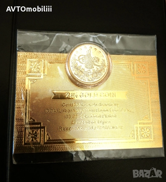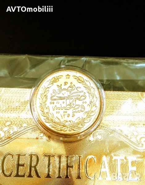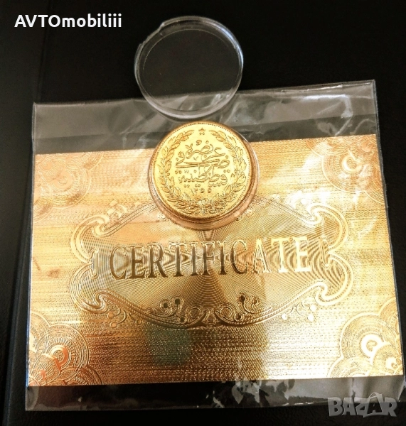 Позлатена с 24 карата злато монета 100 куруша 1856 г със сертификат → Обява 51857049