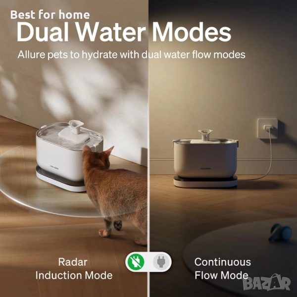 Двойни режими на вода - Новодобавеният индукционен режим с усъвършенстван радарен сензор на диспенсъра за вода за кучета осигурява 42-секунден поток само когато усети вашия домашен любимец на разстояние до 50 см, запазвайки мощността, като същевременно насърчава домашния любимец да отпие. Междувременно можете да го включите в контакта за непрекъснат поток вода в нормален режим.