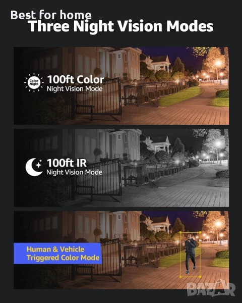 【От черно-бяло до цветна нощ】 С инфрачервеното нощно виждане по подразбиране, човек и превозно средство се задействат и превръщат зрението в цветно; дори в по-тъмна среда, цветното нощно виждане е запазено при осветеност над 0.005Lux; освен това, режимът на инфрачервено нощно виждане и цветно нощно виждане се превключва. (Разстояние на инфрачервено и цветно нощно виждане от 100 фута)