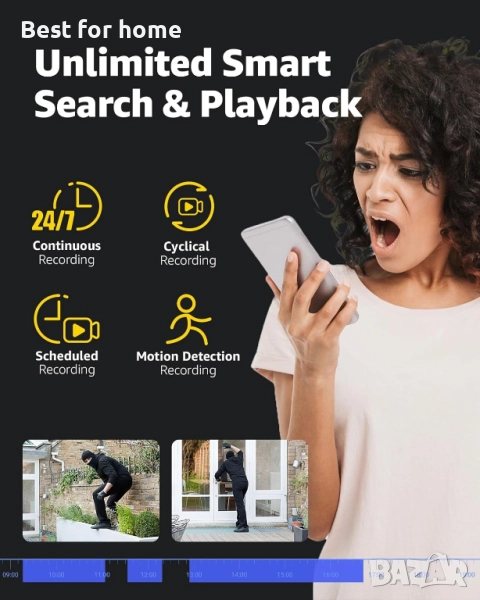 【Интелигентно търсене и възпроизвеждане】Тази интелигентна PoE камера ви улеснява да намерите това, което искате в множество видеоклипове, и ви помага да локализирате важните клипове за секунда. Нещо повече, можете да осъществявате достъп и да управлявате камерата C1200, за да осъществявате дистанционен достъп чрез приложението ANNKE.