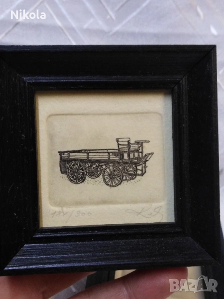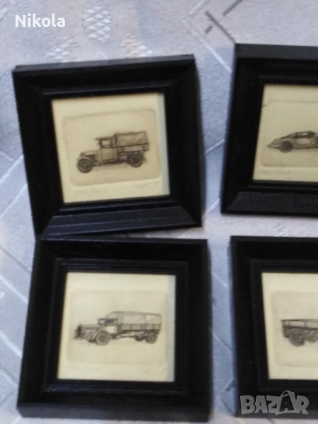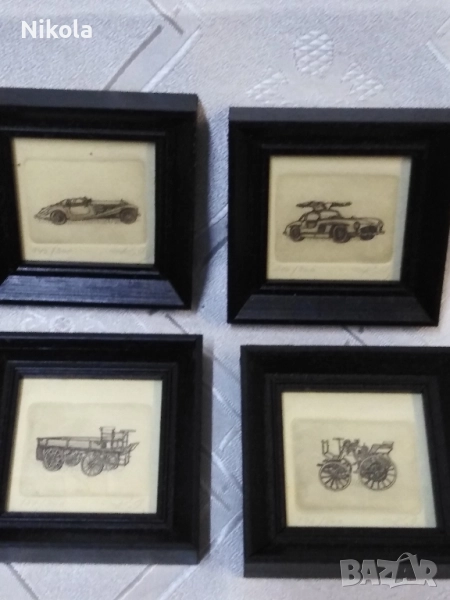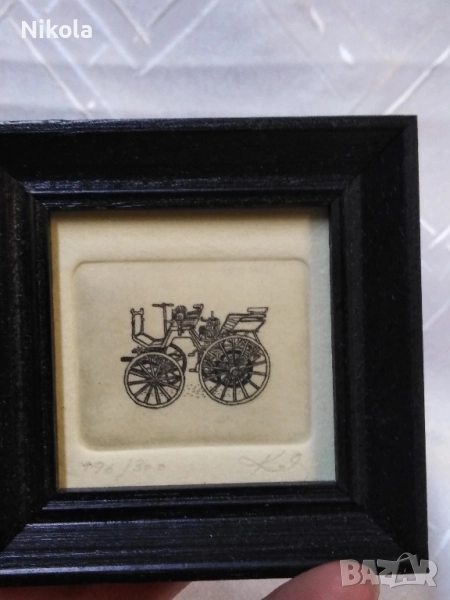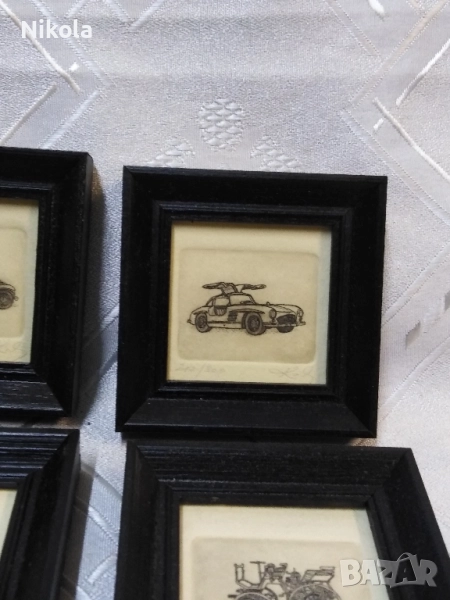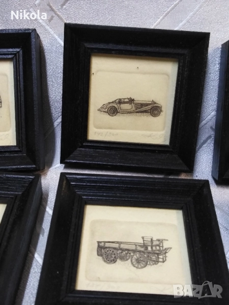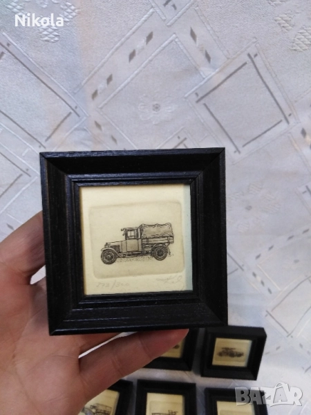 Колекция от 6 миниатюрни рамкирани илюстрации графики с лимитиран тираж на автомобили,всяка с различен номер брой от общо 300 .Цена 150 лв