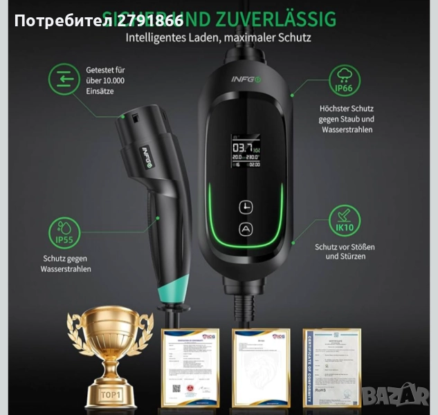 - Здрав и безопасен дизайн - Създаден за ежедневна употреба. Това зарядно за електрически превозни средства може да издържи над 10 000 цикъла на включване - което означава години надеждна употреба. С клас на защита IP66 за корпуса и IP55 за зарядния контакт, то е защитено от вода и прах. Освен това е удароустойчиво и лесно издържа на падания - идеално за мобилна употреба!