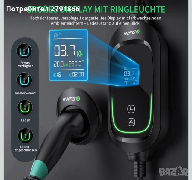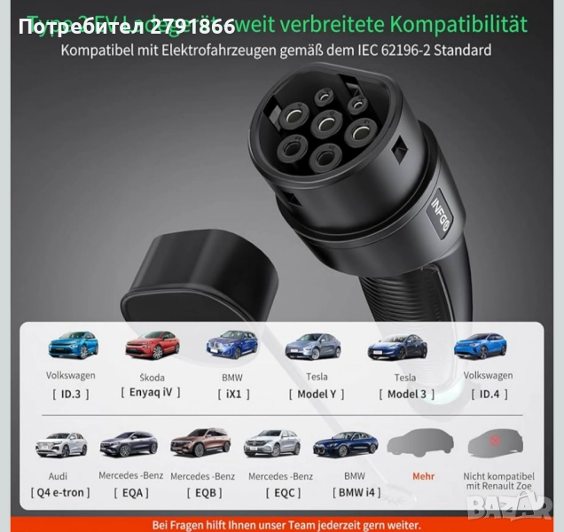 - Широка съвместимост - Заряден кабел тип 2 за много превозни средства! Нашата мобилна стенна кутия INFGO е съвместима с електрически и хибридни превозни средства с конектори тип 2, като ID.3, ID.4, Enyaq iV, iX1, i4, Model 3, Model Y, Q4 e-tron, EQA, EQB, EQC и много други (съгласно стандарта IEC 62196-2). А с дължина на кабела от 8,1 метра можете лесно да зареждате втория си автомобил в гаража или алеята.