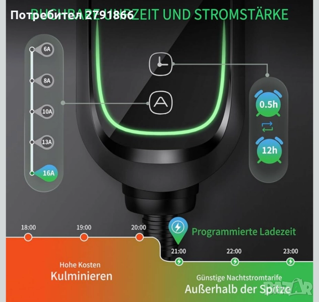 - Интелигентно предварително задаване на времето за зареждане - Възползвайте се от евтините нощни тарифи за захранване. Благодарение на удобната функция за предварително задаване на времето (0,5-12 часа), можете да зареждате автомобила си точно когато е най-евтино. Така не само спестявате пари, но и използвате захранването ефективно. Просто задайте желаното време за зареждане и спете спокойно - колата ви е готова за шофиране на сутринта!