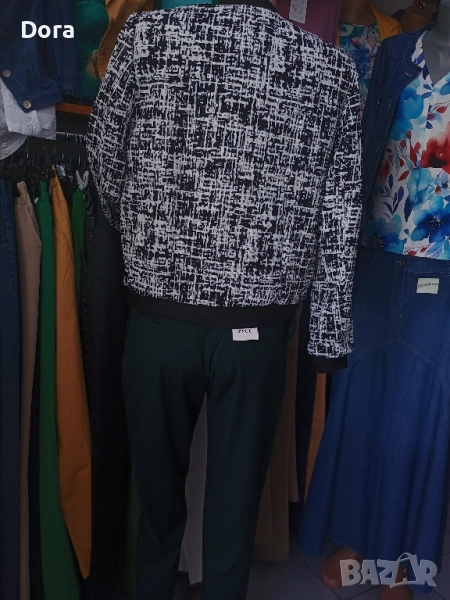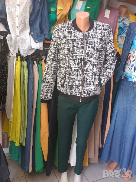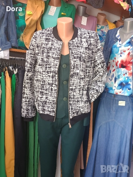 Дамско яке пролет -есен с подплата ,два джоба ,цвят черно-бяло фигурки ситни ,вид пипит.Производител е ,Рени Стил,Русе,фирма известна в България.Якето е свободно с черно бие по ръкавите,по врата и по долната част на якето обкантено.Може да откриете във Варна ул.Др.Пискюлиев ном.6.Заповядайте.Очакваме ви.