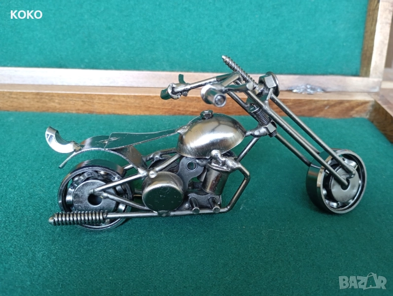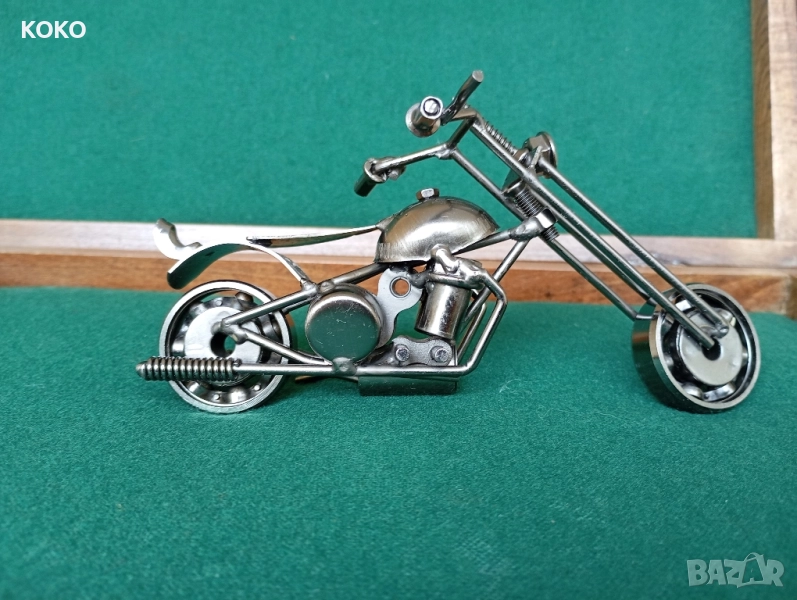 метално моторче ,гумите са от лагери и се въртят ,кормилото завива ,направено е от болчета ,гайки ,винтове ,подходящо за колекции ,подарък ,украса
