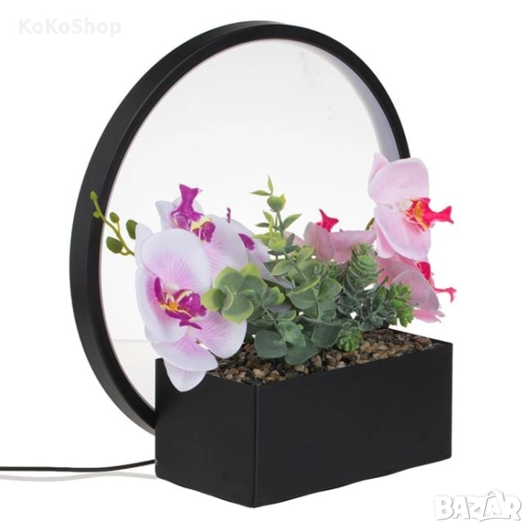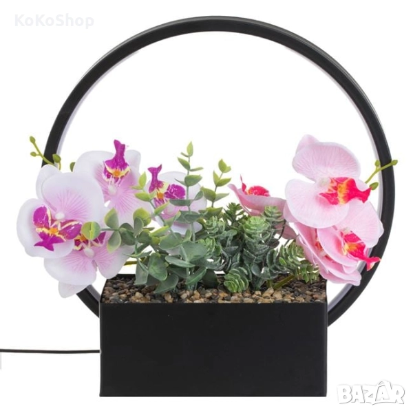 Декоративна ИЗКУСТВЕНА орхидея, с LED осветление. Светещи ринг съдържа 108 броя LED светлини в топло бял цвят и USB кабел с дължина 140 см. Декорацията е с дистанционно управление за включване/изключване и регулиране на светлинната интензивност.