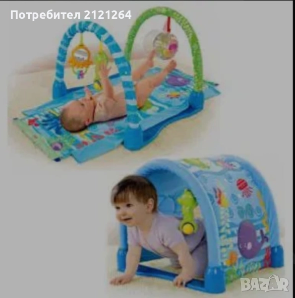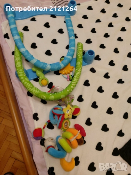 Комплектът съдържа: постелка, 2 подвижни грифа и 3 играчки. Останалите играчки от снимката са подарък за купувача, защото моите деца много се забавляваха и с тях, като им ги закача.