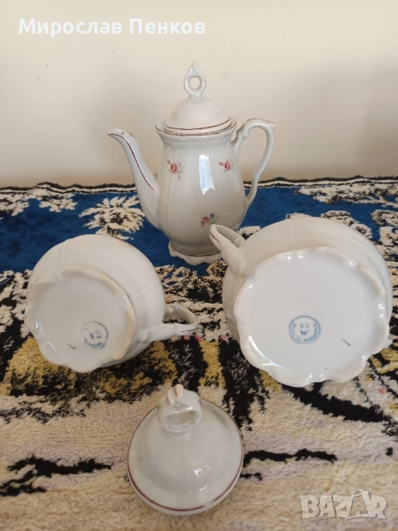 Български бароков сервиз за кафе на Коста Йорданов Видин -чайник, захарница и каничка за мляко.Цената е обща.Размери в снимките.Без забележки.