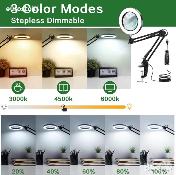 10 настройки за яркост и цвята: 3 цветови режима (студена бяла светлина / бяла светлина / топла светлина) според нуждите, като яркостта на отделния цветови режим на светлината може да се регулира между 10% и 100%. Лупата ви предлага два начина за управление на осветлението: бутон за линия и дистанционно управление.