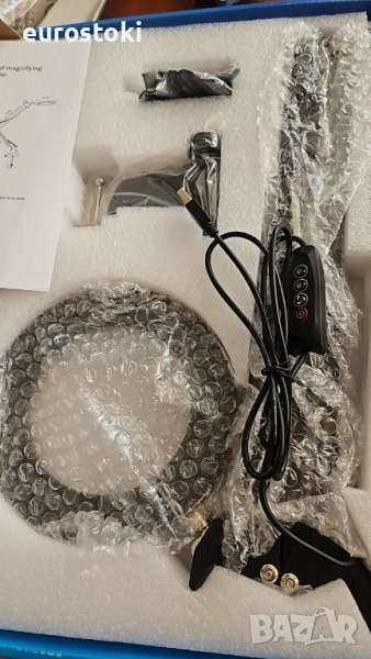 Оборудван с две рамена с дължина 36,8 см, които могат лесно да се регулират на 360°. Свободно прибиращ се за пестене на място, удобен за гледане от различни ъгли и осигуряващ най-добра светлина, като същевременно освобождава ръцете ви. Металната затягаща основа и високоякостната пружина осигуряват стабилност, така че настолната лупа да не се преобърне.
