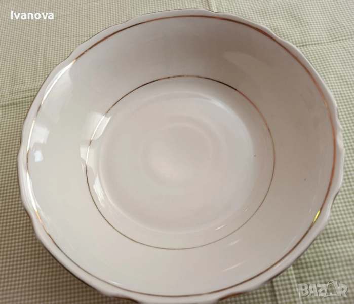 Продавам използвана купа български порцелан с златни ленти за салата и др. Има леко чукната на