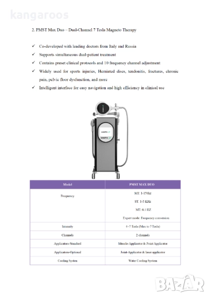 AresPro PMST MAX – двуканален терапевтичен апарат Physio Magneto Super Transduction, доставящ енергия до 7 Tesla. Оборудван с два специализирани апликатора, той е насочен към различни индикации и области на лечение за прецизна грижа.