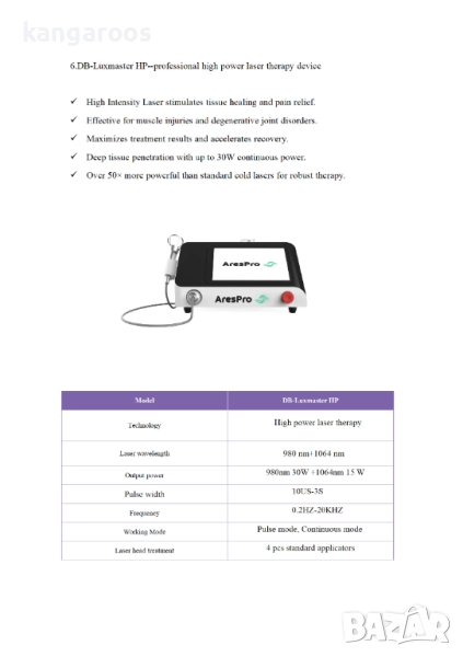 🔹 Дължината на вълната 1064 nm - дълбочина на проникване до 10 см в тъканите - изключително ефективна за ускоряване на заздравяването и управление на болката. Проектирана за употреба в спортната медицина, ортопедията и рехабилитацията.