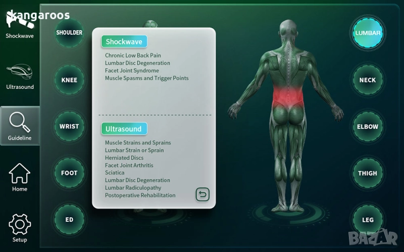 Параметрите на лечението могат да бъдат фино регулирани за професионална употреба във вашия рехабилитационен център: регулиране на енергията на ударната вълна с точност до 0,1 бара, регулиране на енергията на ултразвука с точност до 0,2 W/cm2