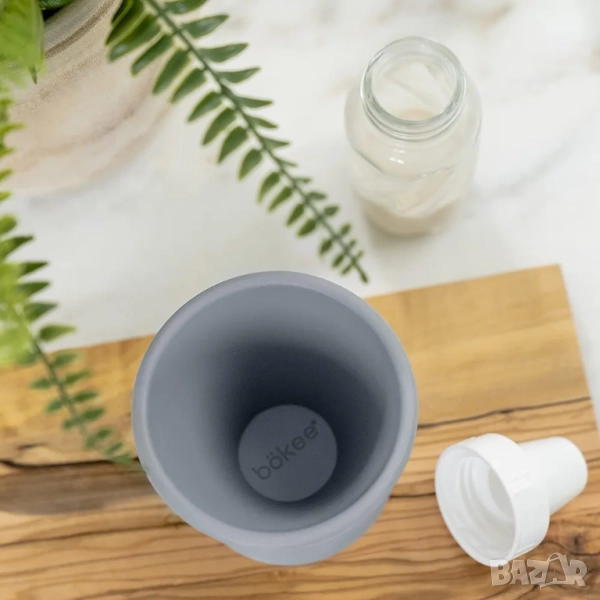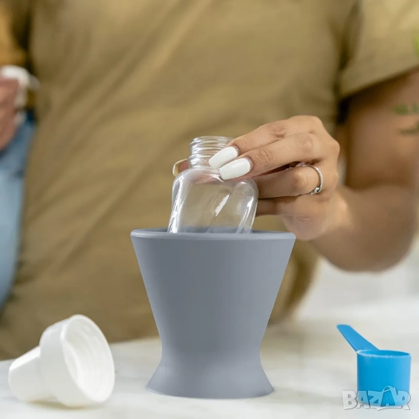 🍼поставете бутилката вътре и я завъртете с лек натиск; вендузата на Bokee държи бутилката на място, така че да може да се отваря, пълни и затваря само с една ръка без никакви проблеми.