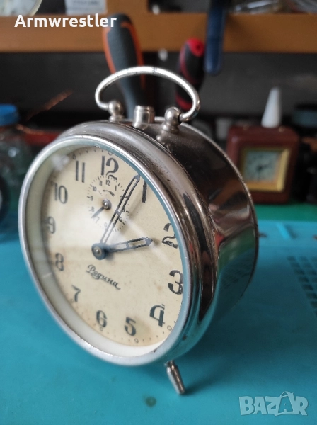 Стар български механичен часовник с будилник. Произвеждани са през 60те години на миналия век. Марката му е Родина. Часовникът е запазен, няма липсващи елементи, работи и будилникът звъни. Механизмът е за обслужване.