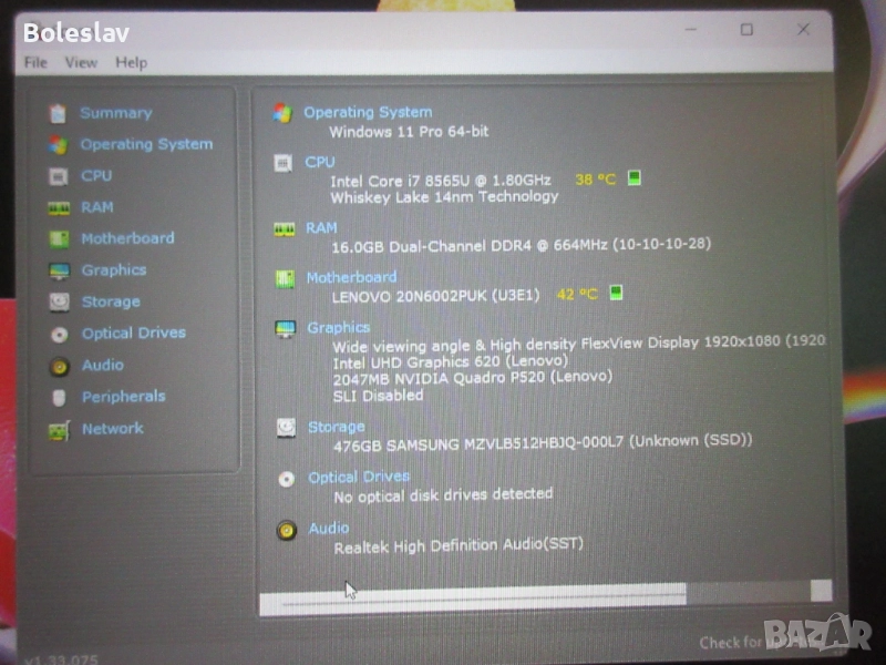 Графична карта: две видеокарти - Intel UHD Graphics 620 + NVIDIA Quadro P520 2GB GDDR5 – сертифицирана графика за CAD, 3D моделиране и професионални приложения