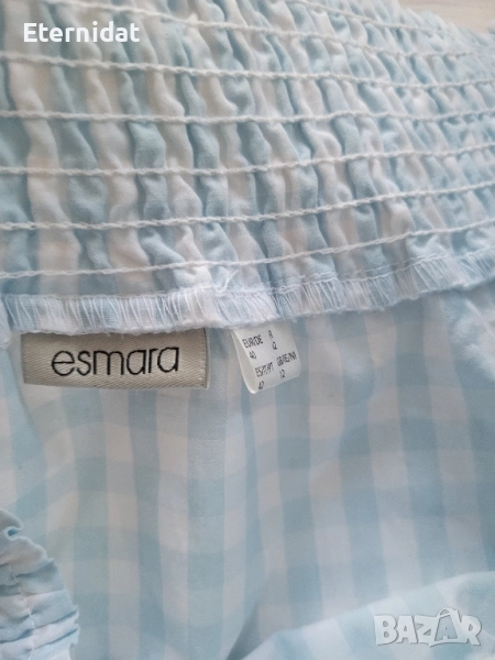 Красива и нежна блузка с бродерии на ръкавите Esmara. Шиток ластик около деколтето позволяващ да се носи и с паднали рамене. Простягаши връзки на ръкавите и долната част ( но може да се носи и изцяло свободна) Размер Л/ХЛ Дължина 59см, гръдна до 110см. Цена 29лв