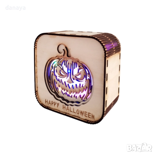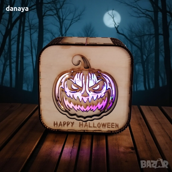 Създайте неповторима атмосфера за най-страшния празник с тази светеща Хелоуин декорация тиква. Декоративната лампа е изработена от дърво с изрязан орнамент на страховита тиква и надпис Happy Halloween, която свети в различни цветове с помощта на LED светлина. Подходяща е за украса на дома, офиса или заведение, като създава мистериозно и ужасяващо настроение.