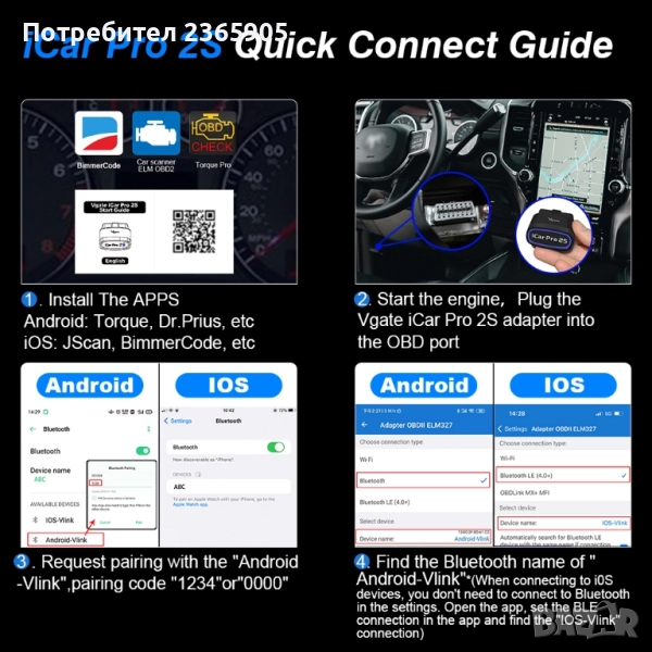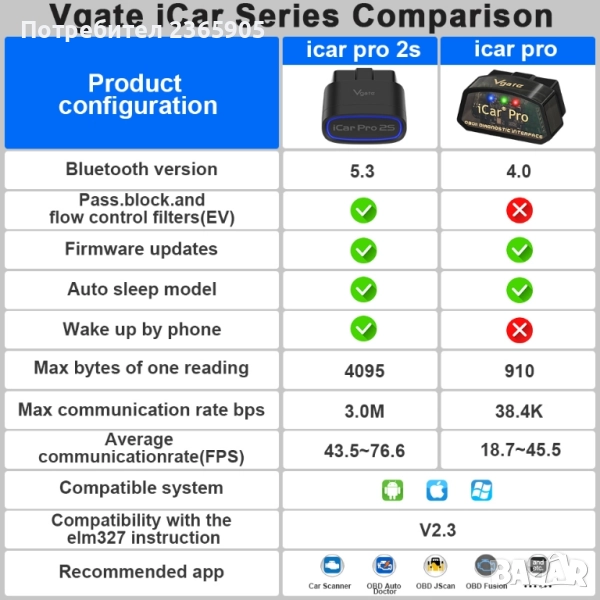 iCar Pro 2S Bluetooth 5.3 OBDII е най- новия и бърз скенер, с най- стабилната връзка, осъществена през Bluetooth v.5.3 на основаната 1980г. канадска фирма Vgate, специализирана в производство на софтуер и хардуер за OBDII авто- скенери. Лесен за употреба, с модерна визия и индикация, работещ на платформа ELM327, който има професионална вечна поддръжка и вградена функционалност за работа с OS Iphone, OS Android и OS Windows(свързва се през Android - vlink). Това заедно с уникалната опция за полуавтоматичен и лесен аофтуерен клиентски ъпгрейд на хардуера го прави един от върховите постижения в този клас. С подобрения достъп, ще може да осъществи наблюдение и кодинг, дори и след като другите подобни скенери, вече няма да са толкова актуални за конкретната марка или модел. Перфектно работи с всички марки и модели телефони създадени в последните 10години, както и с диагностични кодинг програми, като Carscanner, Carista, Vag DPF, Bimmercode, BimmerLink, Torque Pro, EOBD Facile, dr.Prius, OBD Jscan, FAP, Pyclip3, PyDDT, Forscan, Car Diagnostic, ScanMaster, Fastlink, TPMSII, MotorData и много други. Предоставя се възможност за основна или дълбока диагностика, кодинг и наблюдение, като това зависи и от препоръчителния софтуер, free или pro, които се използва за наблюдение на работата на различните компютърни системи, отделните електрони блокове, правилната работа на отделните компоненти и датчици. Диапазонът на работа е за всички коли произведени от 1996 за бензиновите и след 2001 на дизеловите коли.Предоставя разширена и правилна поддръжка, диагностика и кодинг на новите ЕА и хибриди благодарение на бързата блутут връзка и на това, че поддържа всички съществуващи канали и команди за връзка с електронните блокове на колите (подробности за това следват). Всичко това и в съчетание с възможноста за лесен безплатен доживотен софтуерен ъпгрейд на хардуера, което е характерно само за истински, правилно работещ професионален скенер. Така се получава изключителната възможност за разширяване поддръжката на колите, чрез отключване, добавяне или премахване на функции, само с няколко клика през стандартните за всички коли с OBDII- EOBD 16пина, без да се стига до нарушаване на тяхната гаранция. Притежава всички защити за безопасност в процеса на използване и е преминал индивидуален качествен производствен контрол, преди фабричното запечатване със съответната указателна индикация за защита на неговата оригиналност. Поддържа практически всички 9 стандартни протокола за всички коли, като работи с Android /iPhone/Windows, както и всички съществуващи комуникационни канали с версия 1.0 до 2.3. Притежава абсолютно всички 220/220 команди, гарантиращи качество на връзката, без грешки и прекъсвания между компютрите на колата и скенера. Три(3) Мегабитова скорост на обработка на данните, далеч надвишава повечето скенери в този клас и дава възможности, които липсват при много други подобни маркови, но по- стари скенери. Способността да прави ъпгрейд софтуерно, докато е включен постоянно в OBDII при наличие на нов софтуерен ъпдейт(както е и при телефоните ) и бързината, (за секунди, само с няколко клика) от самия телефон, осигурява Vgate iCar Pri 2S с вечна безплатна поддръжка от VGate за съвременна, бърза, най- добра и интелигентна връзка с компютърните блокове на постоянно развиващите се технологично съвременни коли, с техните допълнителни специфични сервизни протоколи за конкретния автомобил, независимо от вид, марка и модел. Удобен, с н
