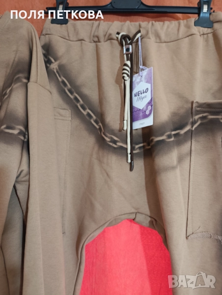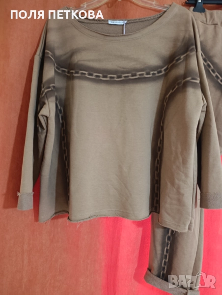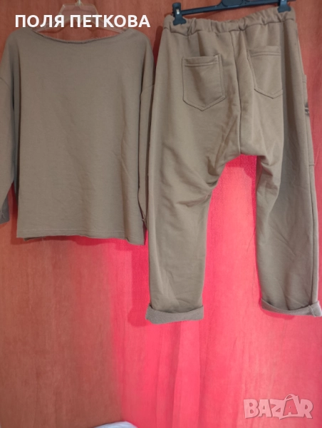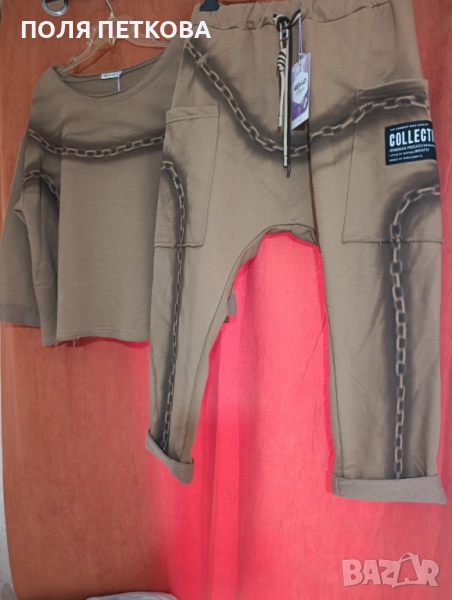 Нов уникален комплект ефектен италиански става за размер L и XL долнището е лек потур блуза гръдна широк свободен модел до 130 надолу ханша също 130 цяла дължина 60 см долнището талия на ластик и с връзки от 80 се разтяга до 110 см ханш 140 до 150 см цяла дължина 97 см има и еластан