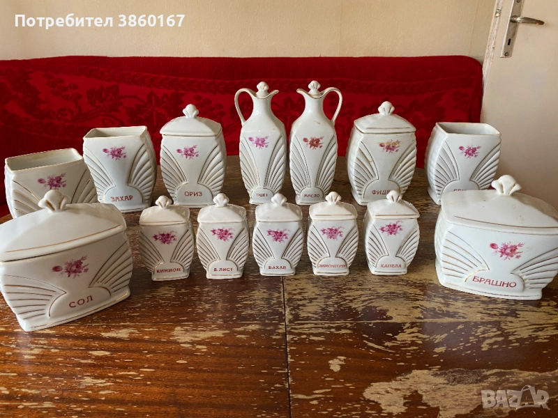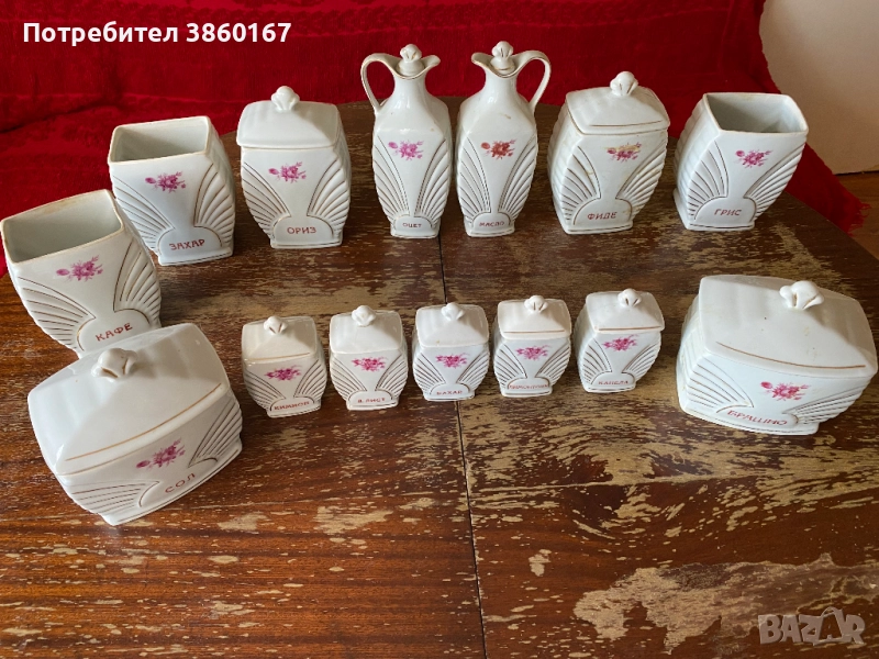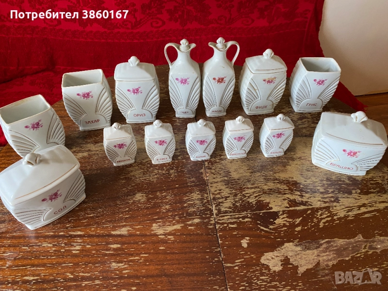 Старинен порцеланов кухненски сервиз за подправки и продукти. Предметите са в използвано състояние, но запазват своята автентичност и очарование.