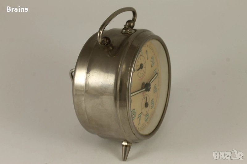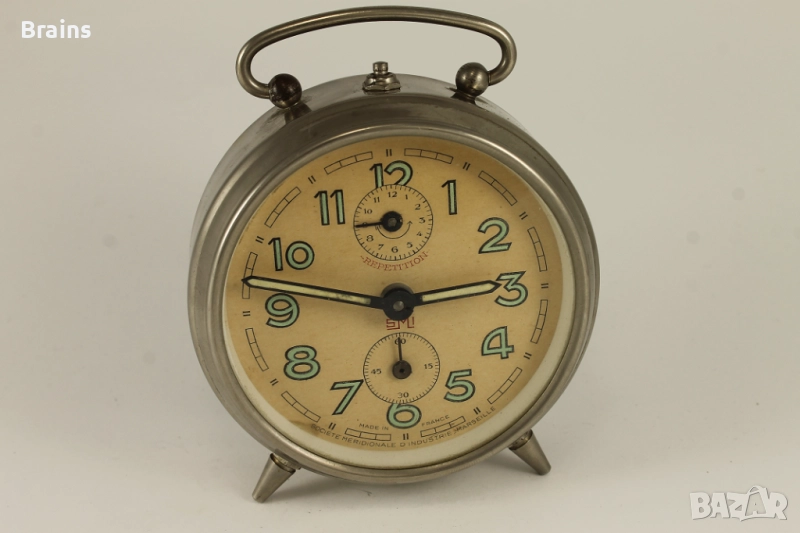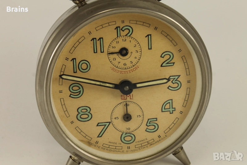 Стар Френски Будилник SMI Repetition. Отлично работещ. С повтаряща се аларма - отначалото единично звънене през 30 секунди 10-тин пъти, и после постоянно звънене. В отлично визуално състояние.