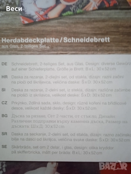 дъска, 2 части, стъкло, дизайн: различни подправки върху каменна дъска, размер на дъската Ш х Д 30х52 см, служи за покриване на готварски печки и котлони, а така също за рязане