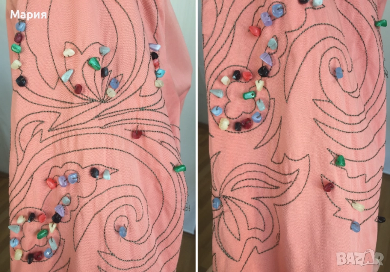 Декорирано е с мъниста, които имитират естествени камъни.