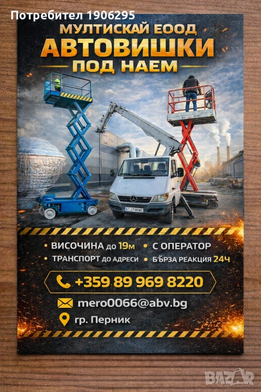 Автовишка цена на час 40евро. Наем и продажба на вишки и друга техника. Цената за наемане на ден зависи от периода за който ще бъде наета!
