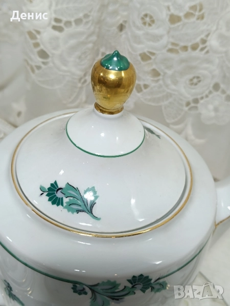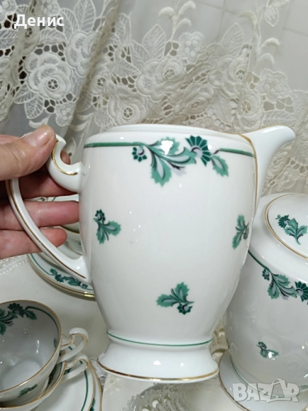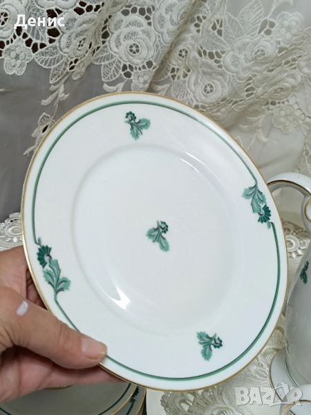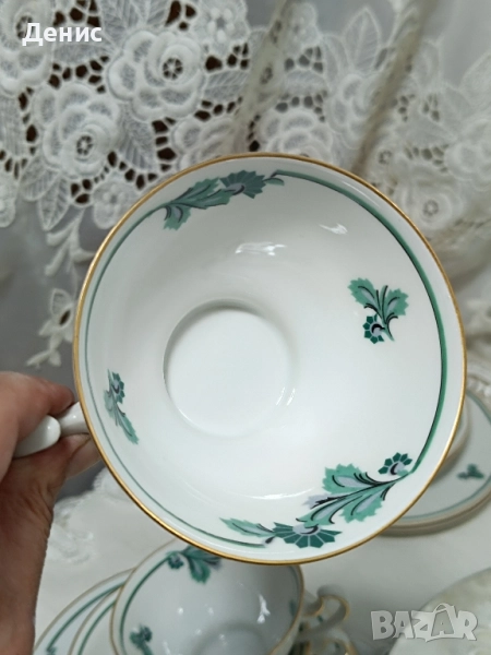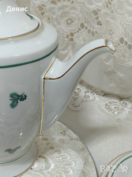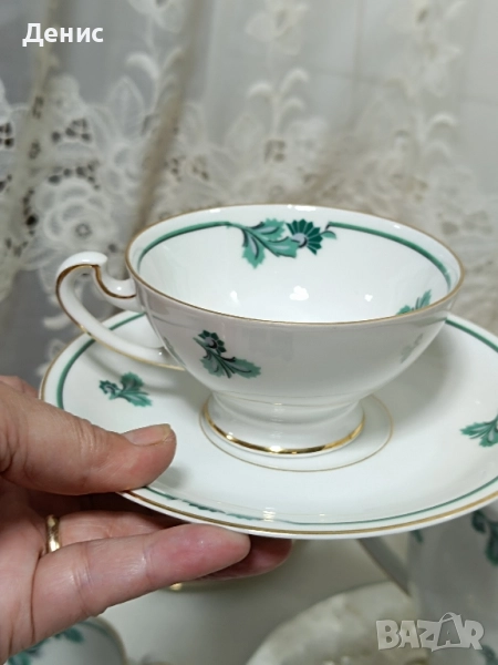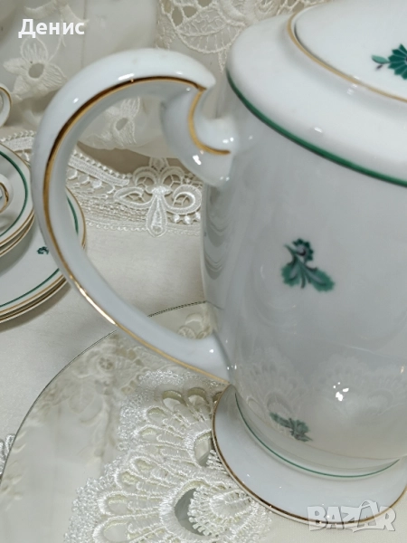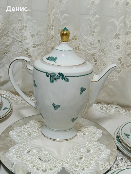 🇩🇪Hertel Jacob🇩🇪 Фабрика основана 1906год.,за която се твърди,че майсторството им се равни на Rosenthal. Тройни сетове ,с изящно изрисувани листа в тюркоазен цвят. Нежни и прозрачни ,придавайки усещане на Свежест. Идеални за колекционери с маркировка от 1930год. -Троен сет с обем на чашката 200мл.до ръбчето. Цена за сет 30лв./15.34€ -Чайник Цена 40лв/20.45€ -Латиера Цена 25лв./12.78€ Състояние:Без чипове и пукнатини.Леко изтъркване на златния кант на места. Опаковам сигурно за моя сметка. Изпращам с куриер за цялата страна с 10%отстъпка на доставката.