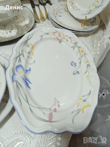 🇩🇪Villeroy &Boch🇩🇪 Моделът Riviera е един от емблематичните сервизи на манифактурата. Отличава се с изключително нежна флорална декорация – ириси, минзухари и други полски цветя в пастелни тонове върху фин бял порцелан с деликатна флоралнa декорация,която носи усещането за елегантност и природна . Лек и лъскав порцелан , издаващ кристален звън при допир,впечатляващ със своята лекота, финес и издръжливост . Лесен за поддръжка,подходящ за съдомиялна и микровълнова фурна. Уникален порцелан с невероятно нежен декор и няма да се обяснявам тук,когато го зърнах на витрината как вървях 1 км.пеша ,за да се уверя,че е истина 🤗 Състав на сервиза: -Съд за топло сервиране -Основна чиния Ф 24 см.6бр. -Супена чиния Ф23см. 6бр. -Купа за салата Ф21см./1бр. височина 9см. -Голямо плато 37/27 см. /1бр -Сосиера Състояние: отлично, Блестящ бял порцелан в ярък декор,без чипове. Този сервиз е едновременно практичен и колекционерски ценен, тъй като моделът Riviera вече не се произвежда. Подходящ е за ценители на качествения порцелан и за хора, които обичат да създават стилна и уютна трапеза. Произведение на изкуството ,което превръща храненето в специален ритуал. Опаковам сигурно за моя сметка и отстъпка на доставката 10% .